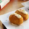 Croquetas de merluza y eneldo terminadas con emulsión de almendra y sidra.