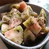 Dados de sepia al wok, pesto de avellanas, chalota confitada, salsa picantona de su tinta y esferas de soja.